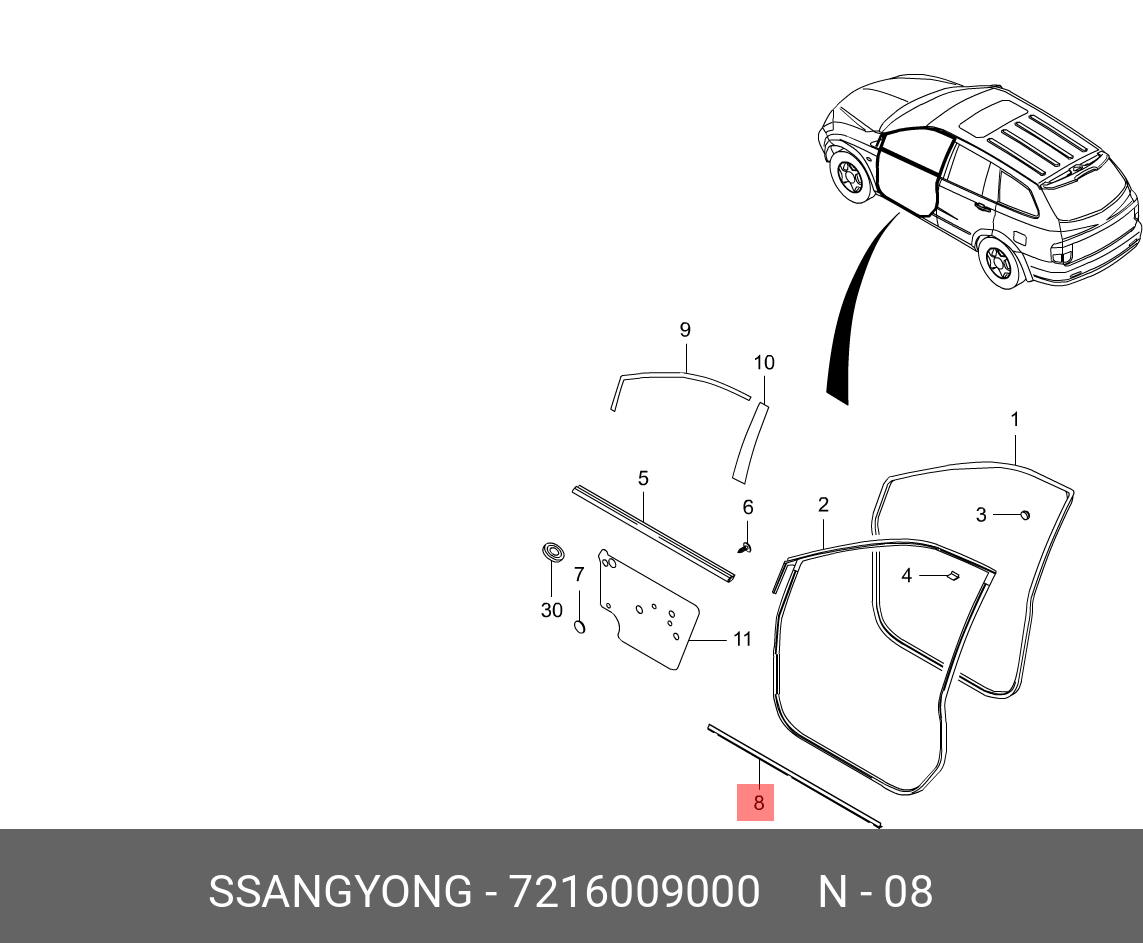 7216009000 SSANG YONG Уплотнитель SSANGYONG Actyon (06-),Kyron (05-),Actyon Sports (06-) стекла двери