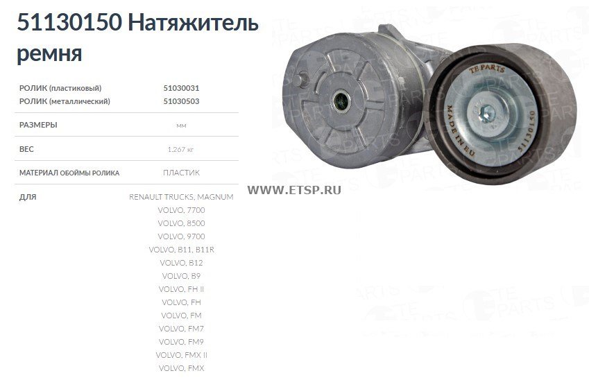 | Дополнительная информация | Натяжитель ремня TE PARTS предназначен для поддержания натяжения ремня. Совместим с Volvo F/FL 6, FH/FM/NH 9/10/12/13/16, Volvo Bus B 9 S/TL, B 12 B/M. |