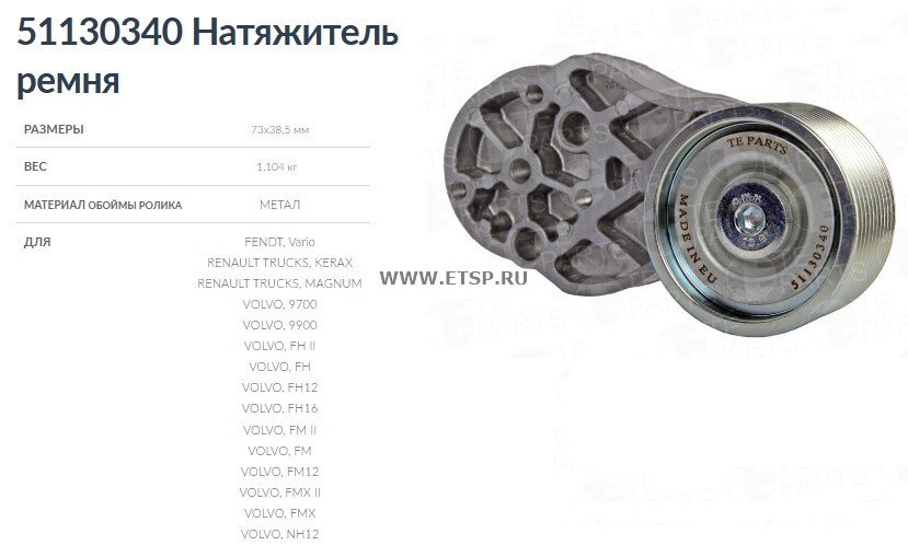 | Дополнительная информация | Натяжитель ремня TE PARTS предназначен для обеспечения натяжения ремня. Совместим с Volvo FH/FM/NH и DXI13 Magnum/Kerax. |