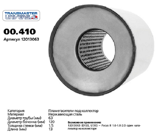 00.410 TRANSMASTER Пламегаситель коллекторный L=130мм (внешн.d=120мм,внутр.d=60мм) нержавеющая стал