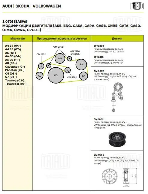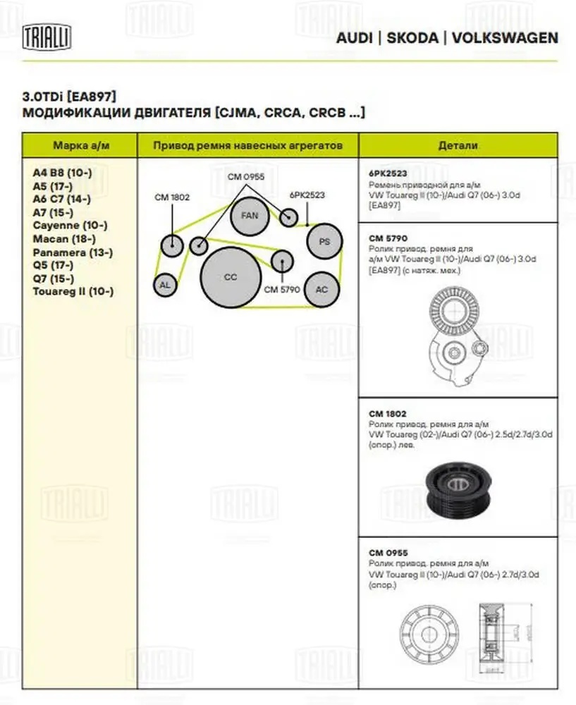 CM0955 TRIALLI Ролик привод. ремня для а.м VW Touareg II 10- ,Audi Q7 06- 2.7d,3.0d опор. CM 0