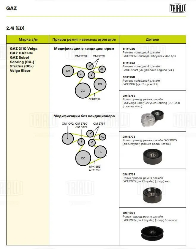 CM 1092 TRIALLI Ролик натяжителя ремня генератора для а/м ГАЗ "КРАЙСЛЕР"дв.(без кондицион.) "TRI