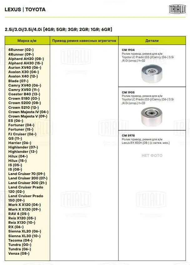 | Наименование | Ролик привод. ремня Toyota LC Prado (02-)/(09-)/Camry (06-) 3.5i/4.0i (опор.) h= |