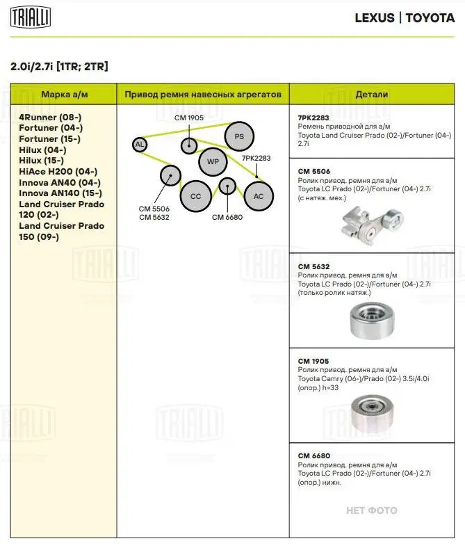 CM 1905 TRIALLI Ролик привод. ремня Toyota LC Prado (02-)/(09-)/Camry (06-) 3.5i/4.0i (опор.) h=
