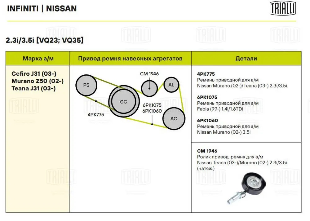 CM 1946 TRIALLI Ролик привод. ремня Nissan Teana (03-) 2.3/3.5 (CM 1946)