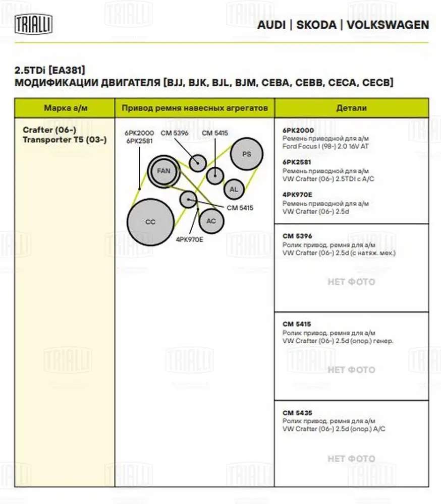 CM 5435 TRIALLI Ролик приводного ремня для автомобилей VW Crafter (06-) 2.5d опорный d90
