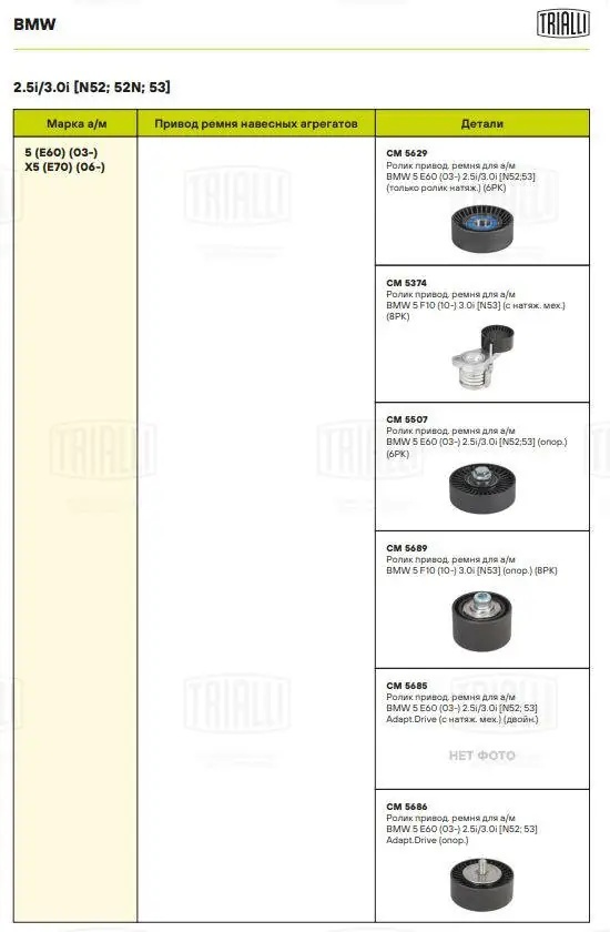 CM5629 TRIALLI Ролик привод. ремня BMW 5 E60 (03-) 2.5i/3.0i [N52;53] (только ролик натяж.) (6P
