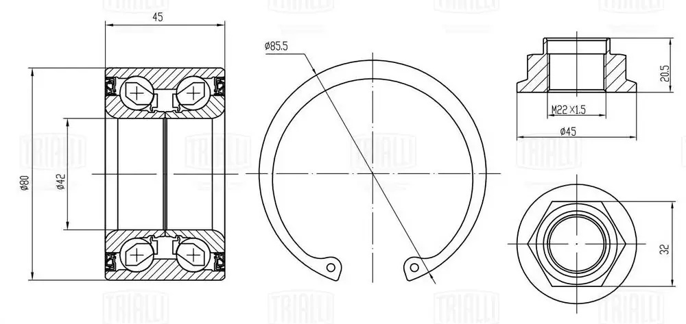 CS1824 TRIALLI Подшипник ступицы Mazda 3 (03-) без ABS перед. (кмпл: подшип./кольцо/гайка) (CS