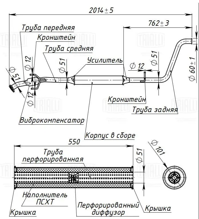 | Наименование | Резонатор для а/м Lada Vesta TRIALLI с гофрой (три кронштейна) (d=51 мм) (алюмин |