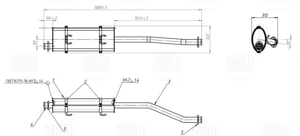 EMM 0308 TRIALLI Глушитель ГАЗель Бизнес (3221) дв. 4216 Евро-3,4 осн. + хомуты (алюм. сталь) (EM