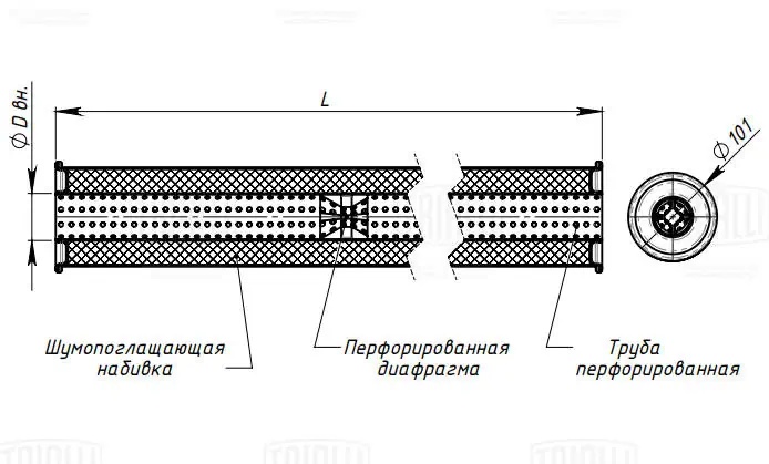 | Наименование | Глушитель универс. (круглый) D=101 с перф. диффузором L=800, d=42 (алюм. сталь) |