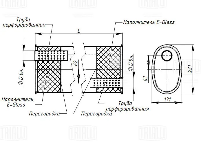 | Наименование | Глушитель универс. (овальный) 131х221, L=485, d=50, смещ. 62 мм (алюм. сталь) (E |