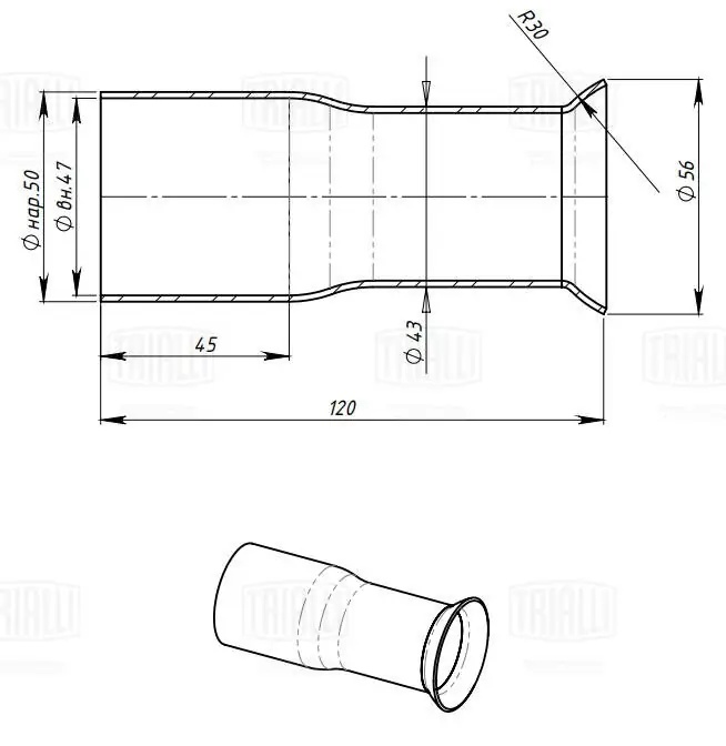 | Наименование | Соединитель труб глушителя - переходник d=50мм/R30/d=56мм L=120 (алюм. сталь) (E |
