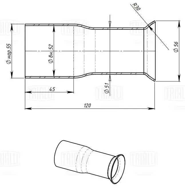 EMP 553056 TRIALLI Соединитель труб глушителя (переходник) d=55 мм/R30/d=56 мм L=120 алюминизирован