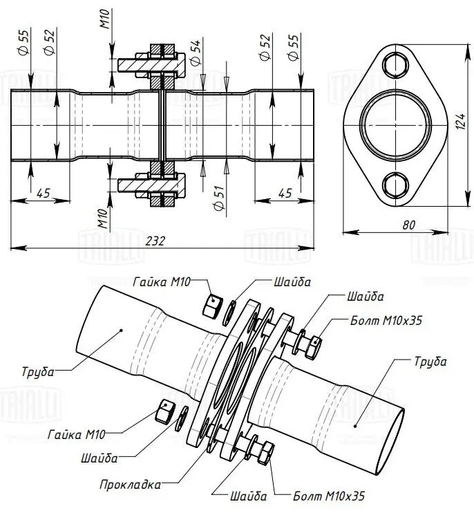 EMP FL-55 TRIALLI Соединение труб глушителя FL-55 L=232 мм алюминизированная сталь