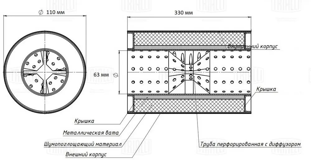 ESM 11033063 d TRIALLI Пламегаситель универс. 110/330-63 с перф. диффузором (нерж. сталь) (ESM 11033063
