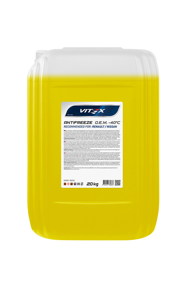 Vitex O.E.M for Renault / Nissan — жёлтый антифриз карбоксилатного типа, созданный для бензиновых и дизельных двигателей автомобилей Renault и Nissan. Обеспечивает надёжную защиту от коррозии, накипи и кавитации при температурах до –40 °C, срок службы — до 5 лет или 250 000 км.