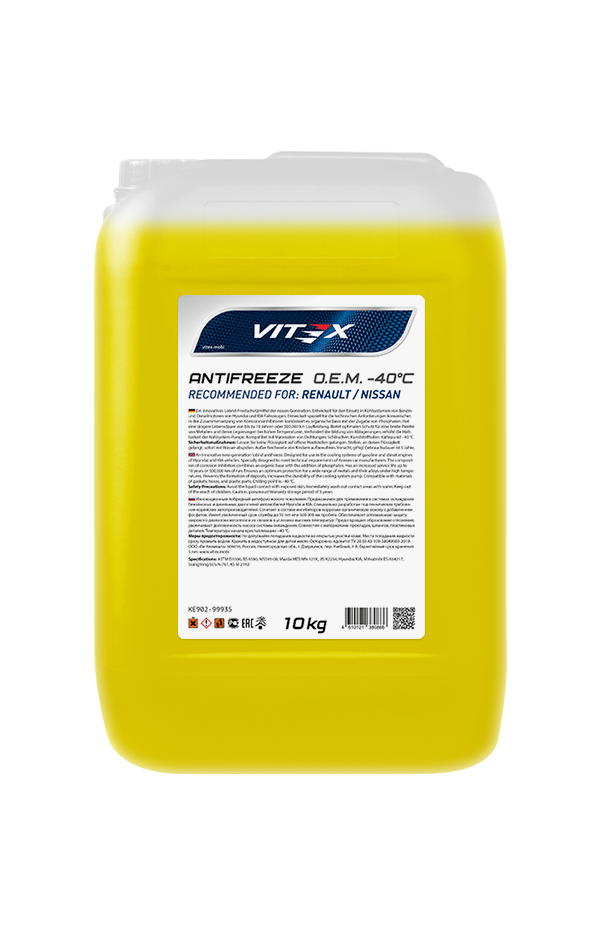Vitex O.E.M for Renault / Nissan — жёлтый антифриз карбоксилатного типа, созданный для бензиновых и дизельных двигателей автомобилей Renault и Nissan. Обеспечивает надёжную защиту от коррозии, накипи и кавитации при температурах до –40 °C, срок службы — до 5 лет или 250 000 км.