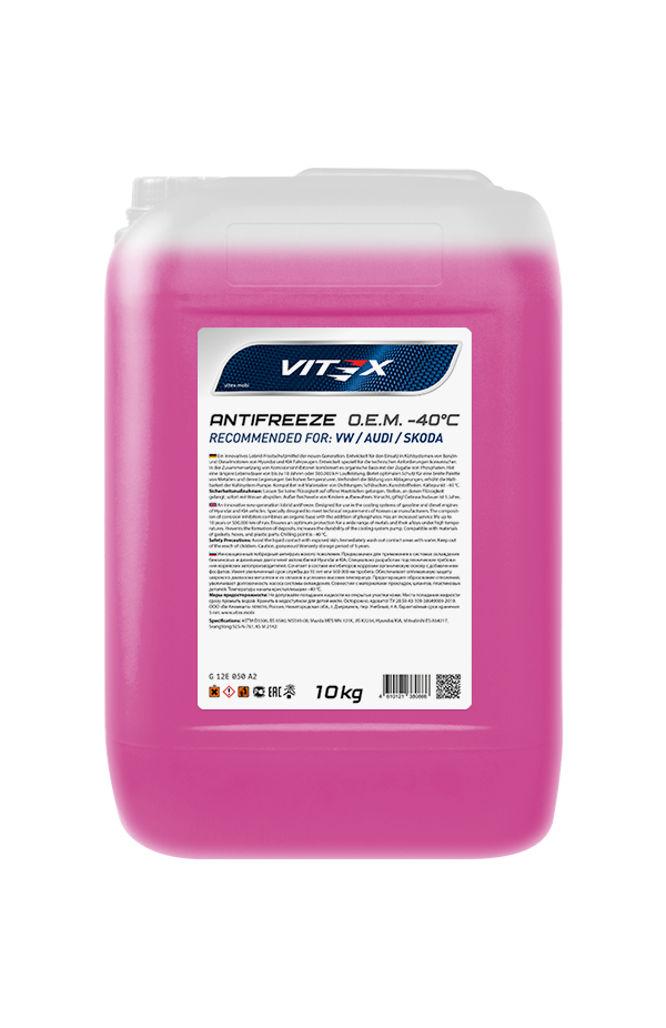 Vitex O.E.M for VW Audi Skoda — фиолетовый лобридный антифриз, созданный по требованиям концерна VAG (Volkswagen, Audi, Skoda, Seat). Обеспечивает максимальную защиту от коррозии, кавитации и перегрева, рассчитан на срок службы до 10 лет или 500 000 км.