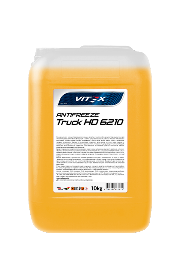 Vitex Truck HD 6210 Yellow — всесезонный лобридный антифриз для систем охлаждения тяжело нагруженных дизельных и газовых двигателей. Обеспечивает защиту от коррозии, кавитации и перегрева при температурах до −40 °C. Рекомендован для техники Caterpillar, Cummins, Volvo Penta, Renault Trucks и др.